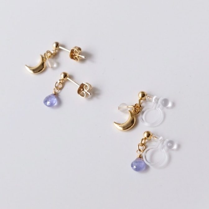 標準のピアスは真鍮メッキ製、イヤリングはノンホールピアス(樹脂イヤリング)を使用しています。